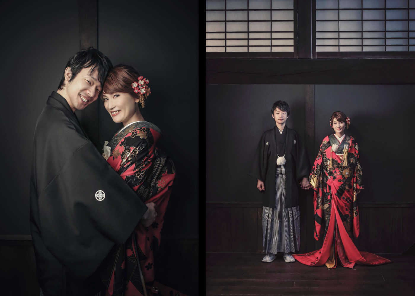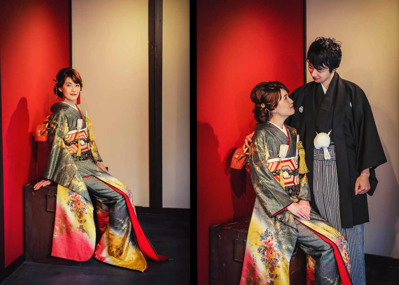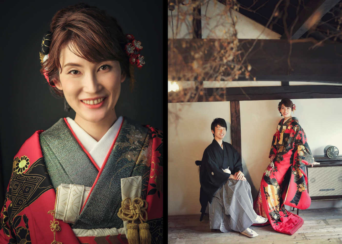 和装で写真撮影するなら、衣装は絶対「赤と黒」と決めていました。それをベースに様々な色合せやお着物を見せていただき、一目惚れしたのがこの赤と黒と金の打掛。そして、ラメ使いの黒い引振袖。もちろん、他にもたくさん試着させていただきましたが、やっぱり一目惚れから気持ちが変わることはありませんでした。