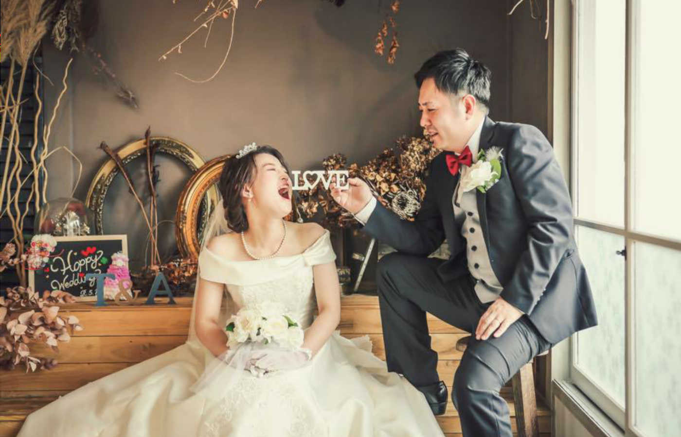 またせっかく写真に残すならオリジナル感を出したいと2人で相談して、手作りのアイテムを持ち込み撮影に使いました。事前にプランナーの順子さんとやりとりをしてイメージ通りに撮影を進めてもらいました。
