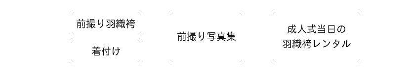 ・前撮り振袖・前撮り着付け・前撮りヘアメイク・前撮り用髪飾り・小物一式(帯、帯揚げ、帯締め、長襦袢、伊達襟、草履、バック)・着付け用小物(足袋、肌着、襟芯、前板、後板、帯枕、伊達締め、腰紐、三重紐)・古民家スタジオ撮影料